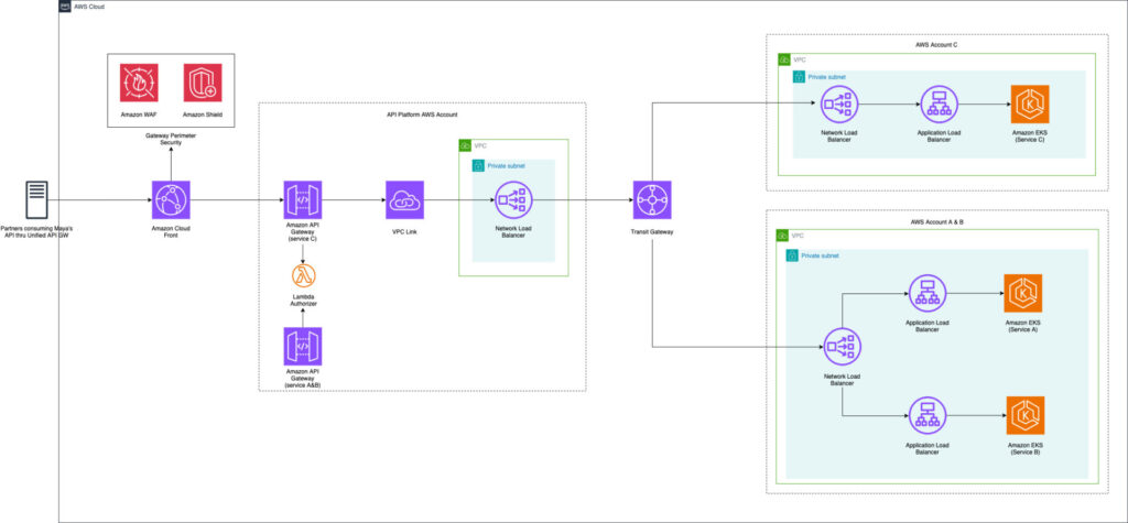 To address these challenges, Maya implemented an API platform, code-named Unified API Gateway. This centralized API management helps enforce consistent standards and improve overall security and observability. The following image illustrates the architecture of the Unified API Gateway and how it integrates with backend services managed and owned by different teams across different AWS accounts.
