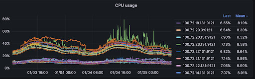 For instance, take a look at this CPU usage graph of individual nodes from our old self-managed setup: