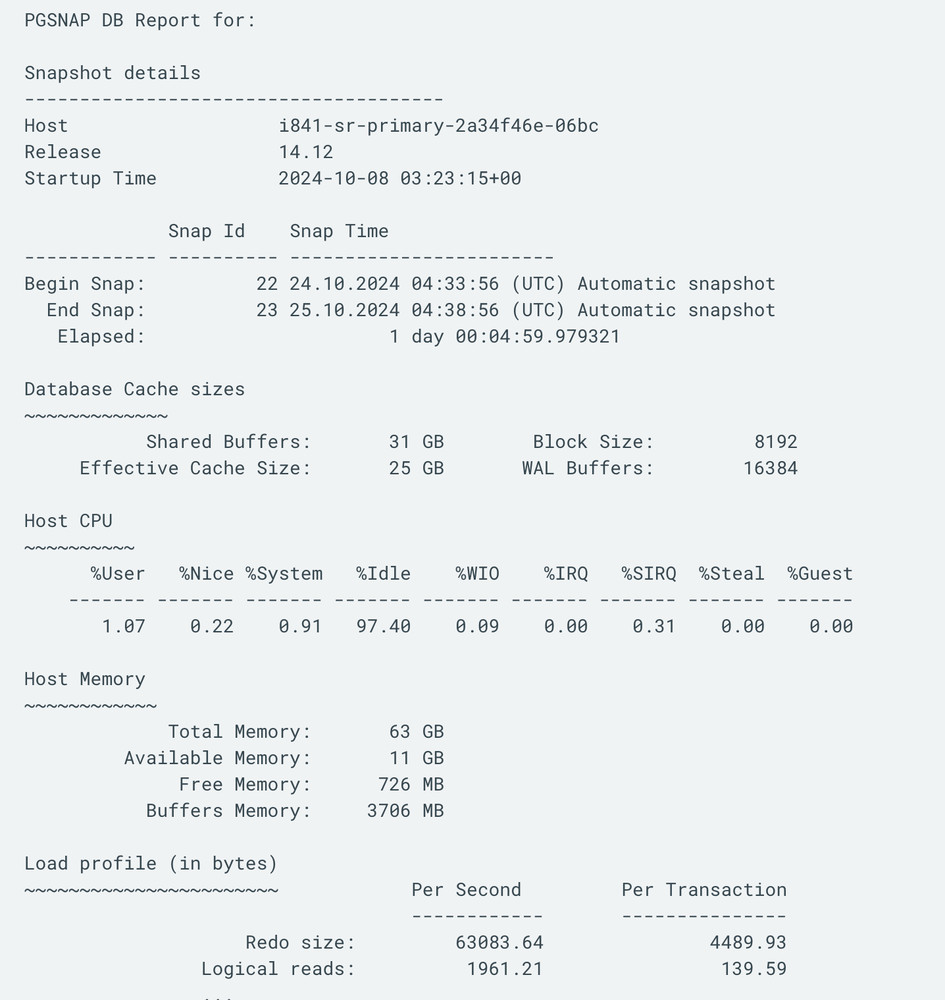 The image above demonstrates an initial portion of the performance snapshot report. For more details on various sections, refer to this table. For additional wait events, refer to the wait events documentation.