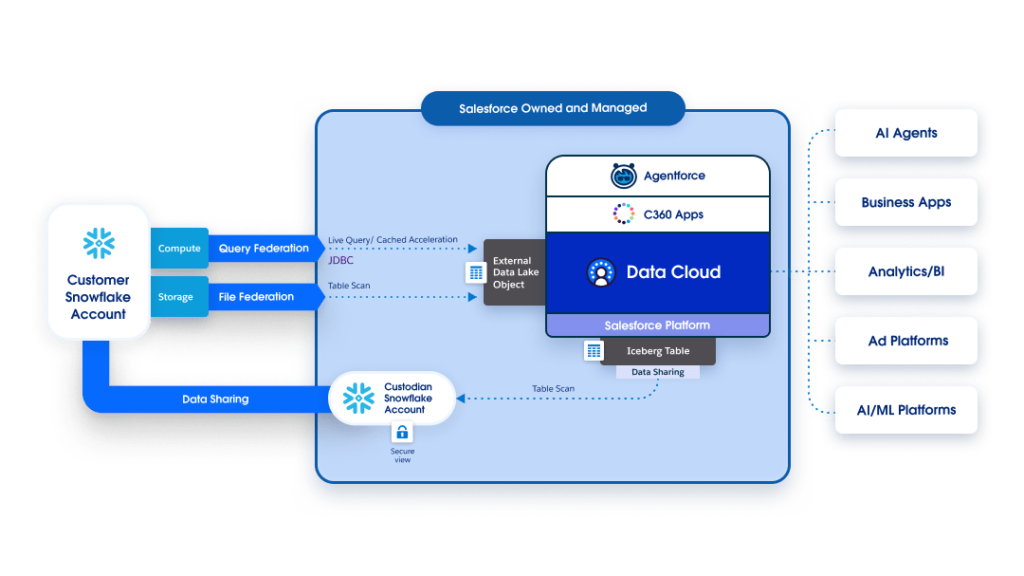Last year, we took a significant step towards this vision with the introduction of data federations in Salesforce Data Cloud. Today, we’re thrilled to announce the Beta launch of Zero Copy File Federation, a powerful evolution that makes it even better to shatter data silos and unlock the full value of your enterprise data. This groundbreaking capability represents a pivotal advancement in our Zero Copy approach, offering a distinct and optimized pathway to access the vast datasets typically residing in data lakes and lakehouses, complementing our existing query federation capabilities. File Federation accesses data directly from Iceberg tables at storage level without compute overhead and hence is better suited for large-scale, high-volume datasets where performance and cost efficiency are crucial.