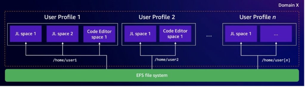 Cross-instance file sharing – Users can access their files from multiple SageMaker Studio spaces, because the EFS file system provides a persistent storage solution.