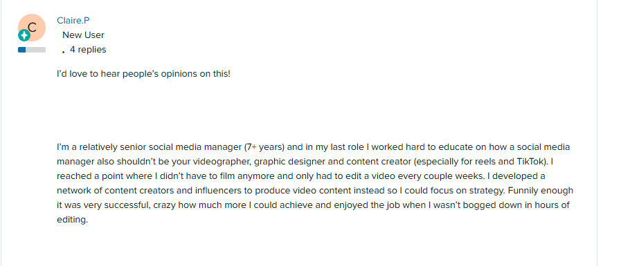 This is why the job role of a social media content creator must be clear for hiring departments. On The Arboretum, Sprout’s community forum, Claire.P explains that she’s a senior social media manager who’s had to educate her company about how important it is to have separate content creators to rely on for content production.