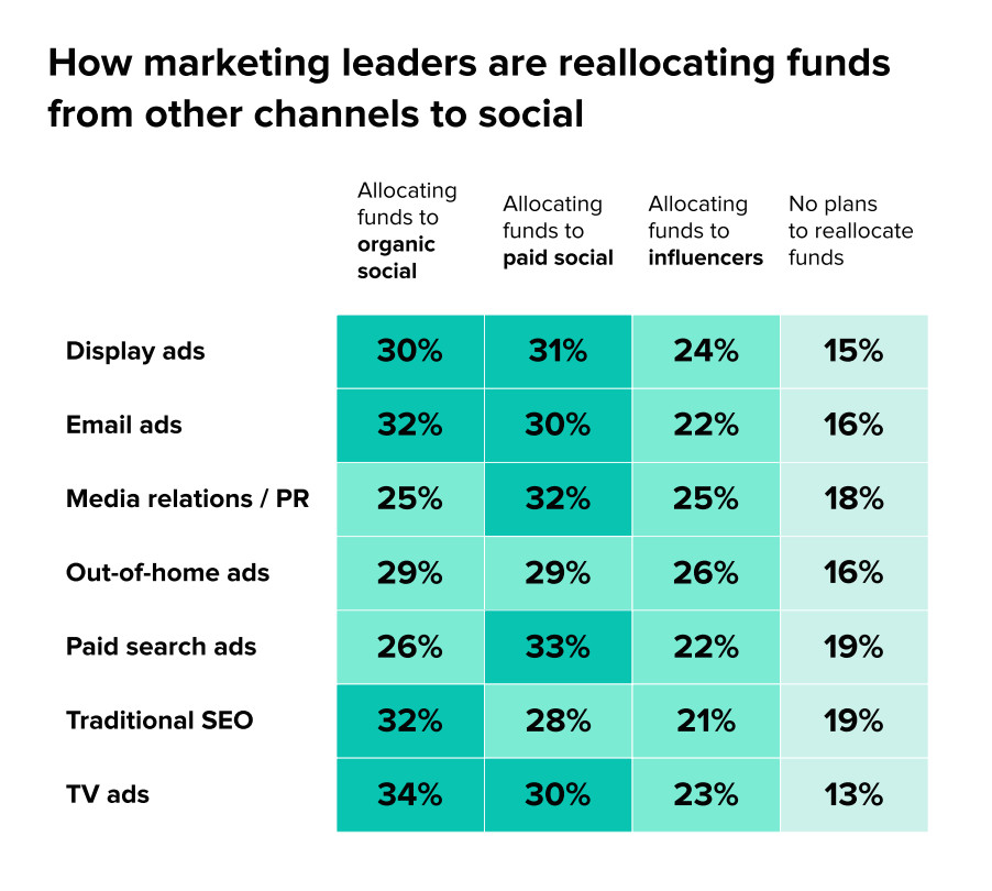 And much of these budget increases are reallocated funds. Eighty-one percent of marketers are reallocating budgets away from traditional SEO and into organic social, paid social and influencer marketing.