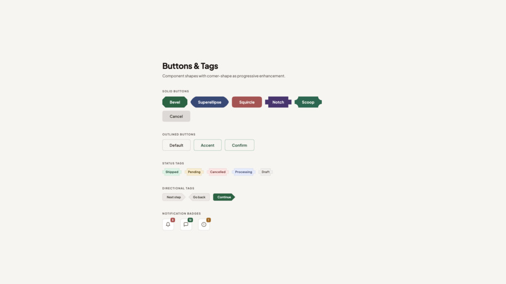Much has been said about CSS corner-shape, by us and the wider web dev community, despite only being supported by Chrome for now. It’s such a fun feature, offering so many ways to turn boxes into interesting shapes, but Brecht De Ruyte’s corner-shape article focuses more on how we might use corner-shape for everyday UI elements/components.