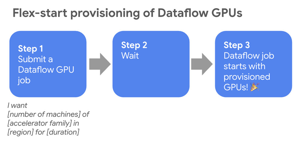 • Flex-start GPU provisioning: For batch jobs with flexible start times, securing GPUs can be a manual and uncertain process due to high industry-wide demand. Our new flex-start provisioning model enabled by  Dynamic Workload Scheduler (DWS) effectively addresses this issue: Instead of a job failing when accelerator resources are unavailable, Dataflow now queues your job and automatically starts it as soon as the required GPUs become available. This eliminates the need for repeated manual resubmissions, mitigating stockout risk and accelerating developer productivity.