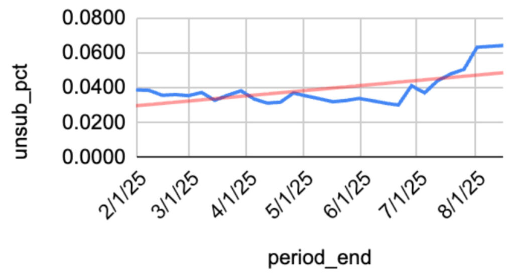 *Image shows unsub rate increase across top 100 senders by volume on the Marketing Cloud Engagement platform between February and August 2025