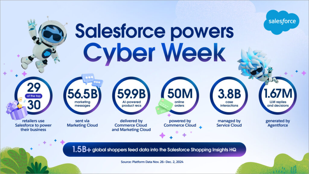 Powered by Agentforce, Commerce Cloud, Marketing Cloud, and Service Cloud, Salesforce analyzed aggregated data to produce holiday insights from the activity of more than 1.5 billion global shoppers across more than 89 countries, with a focus on 18 key markets: the United States, Canada, United Kingdom, Germany, France, Italy, Spain, Japan, the Netherlands, Australia, New Zealand, the Asia-Pacific (excluding Japan, Australia, and New Zealand), Switzerland, Latin America (LAM), the Middle East and Africa (MEA), Eastern Europe, Belgium, and the Nordics. This battery of benchmarks provides a deep look into the last nine quarters and the current state of digital commerce. Several factors are applied to extrapolate macroeconomic figures for the broader retail industry. These and these results are not indicative of Salesforce performance.
