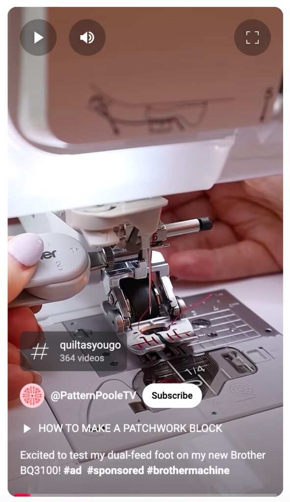 For example, in this sponsored product review from quilting YouTube channel Pattern Poole TV, the influencer highlights the technical features of Brother’s BQ3100 sewing and quilting machine. But they don’t stop there. At the end of the video, they mention they’ll be using the machine for an upcoming quilting project. This approach lets viewers see how it holds up over time, not just in a quick demo.